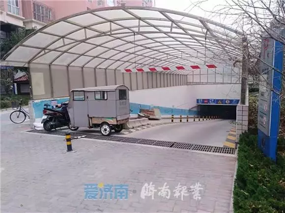 在墙北侧记者看到一处地下车库的入口,其中一半被一辆机动三轮车挡住。记者询问附近居民,这些车辆是否堵住了车库入口。居民表示,地下车库还在使用中,车辆另有出口。