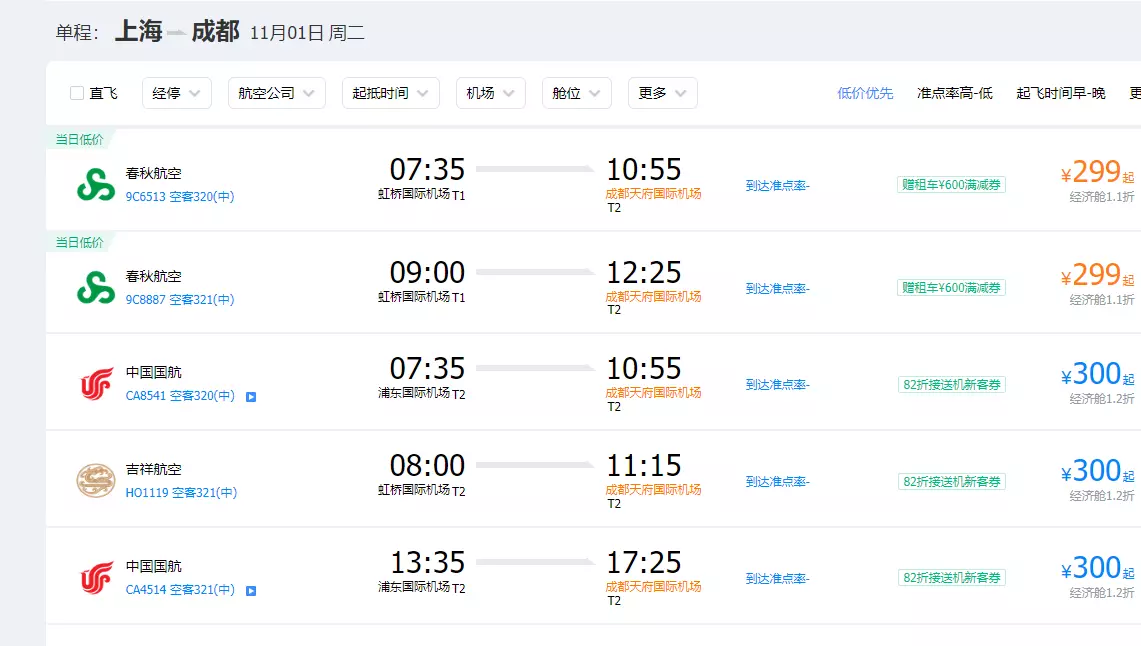 而且,上海到成都之间,如果机票预订得早,还可以预订到低价票,一般300多元左右。