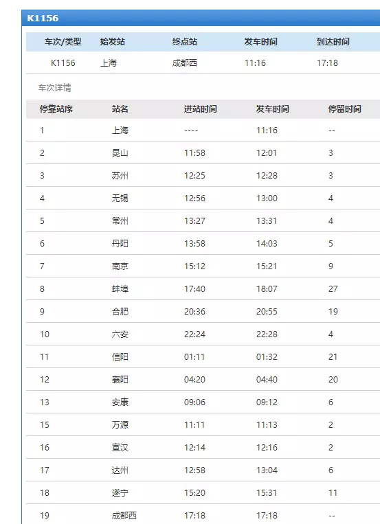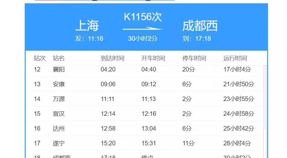 从图中,我们不难看出,K1156次旅客列车,是从上海站发车,终到成都西站的,列车全程运行大约是30个小时左右。