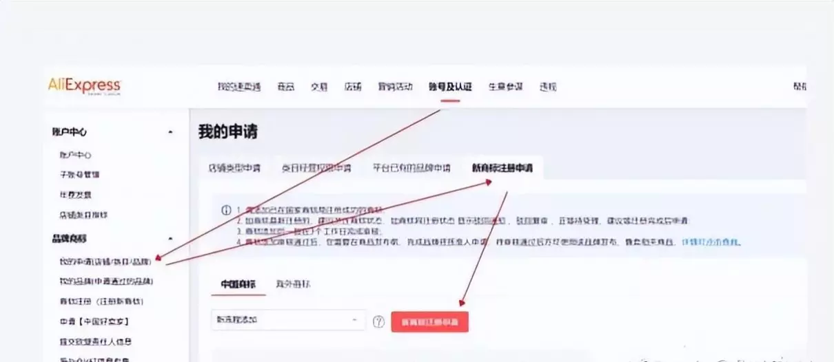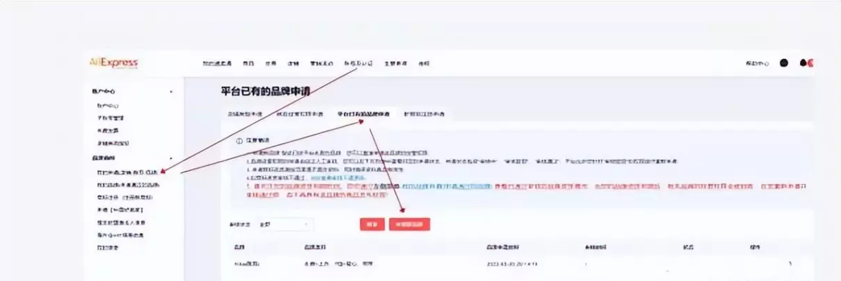 【账号及认证】【我的申请(店铺/类目/品牌)】【平台已有的品牌申请】【申请新品牌】