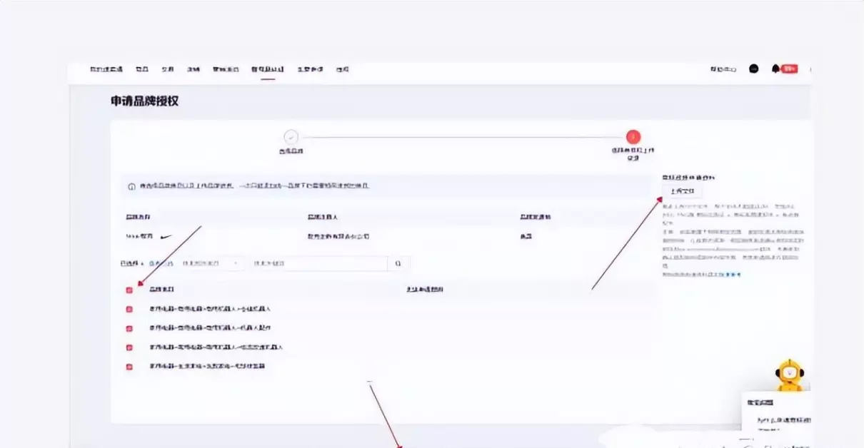 勾选所要经营的子类目,右上角上传商标资质申请材料,如商标持有人与开店主体一致,则直接上传商标注册证或商标受理通知书,如不一致则需要上传品牌授权书。说明:申请官方店需要独占授权书