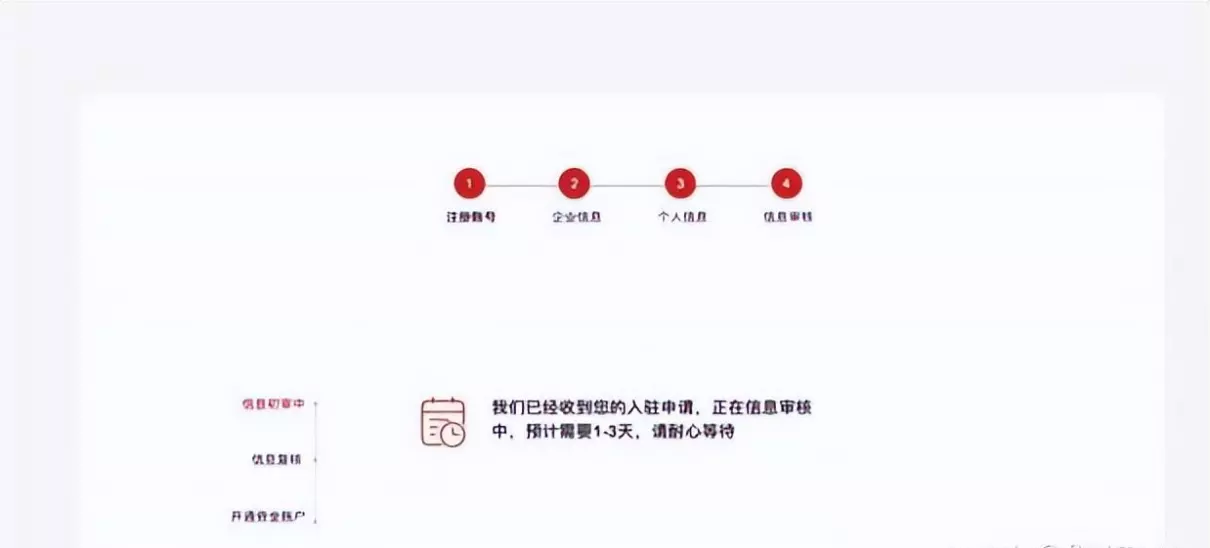 页面展示审核中提醒文案,左侧进度条展示“审核中”进度