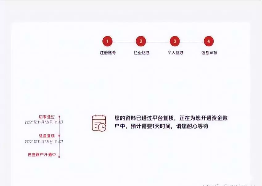 左侧进度条进度和时间更新,需展示“初审通过”状态和时间,“复审通过”状态和时间,以及资金账户开通中的提示