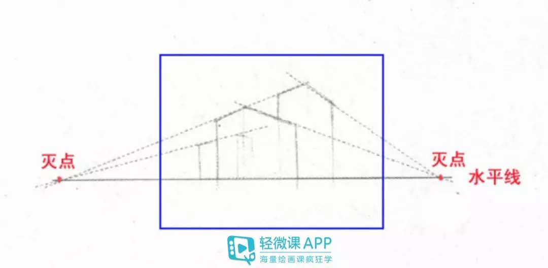 蓝色边框为画框。先确定水平线,再确定两个灭点。拉大两点透视灭点的距离,灭点已经在画面外,可以准备一张更大的纸或想象出灭点的位置。绘制出楼房的大轮廓。