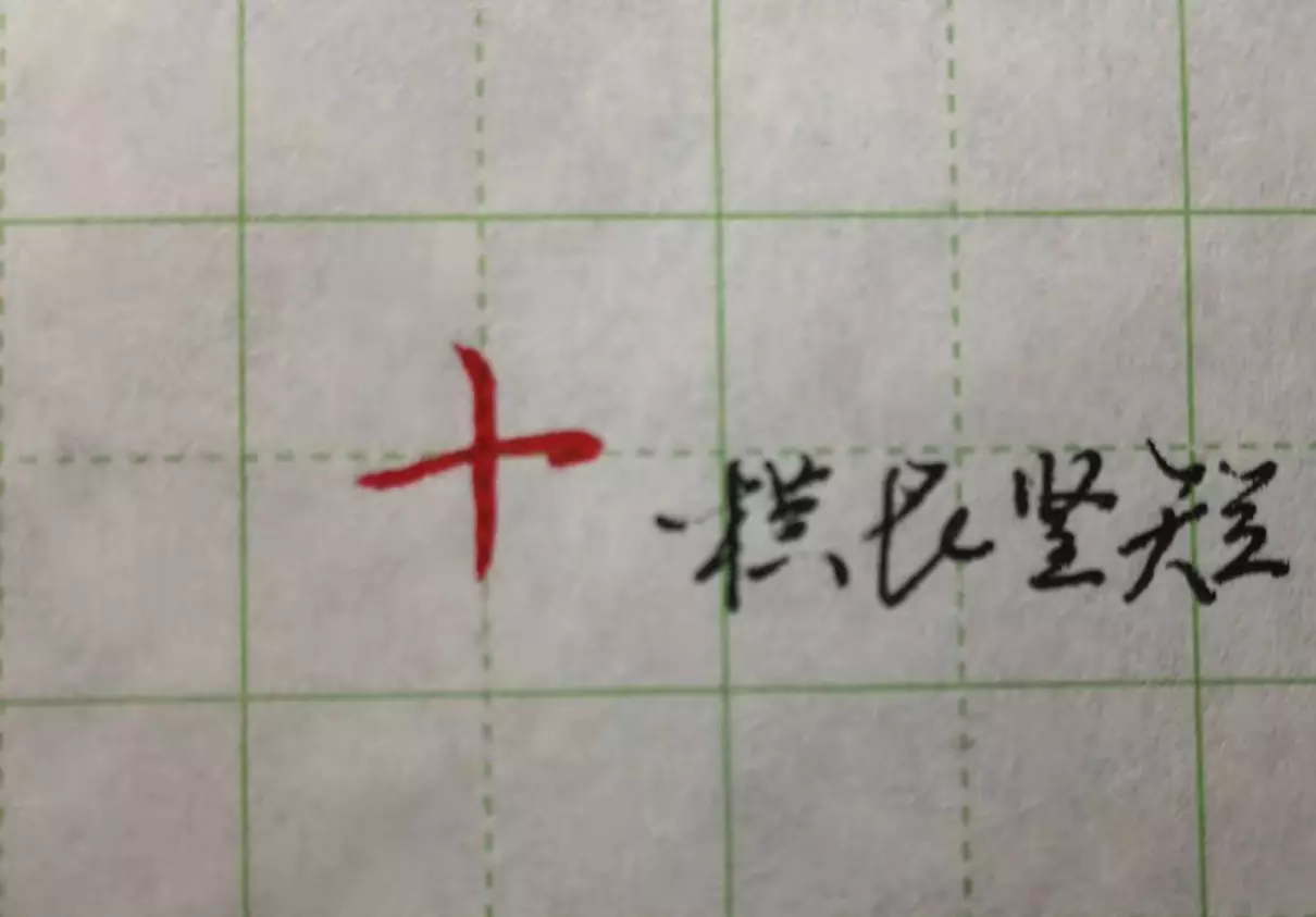 十字,横长竖短,长横穿插竖画的中间位置,但竖画则要在横画的中间位置略往右点起笔。