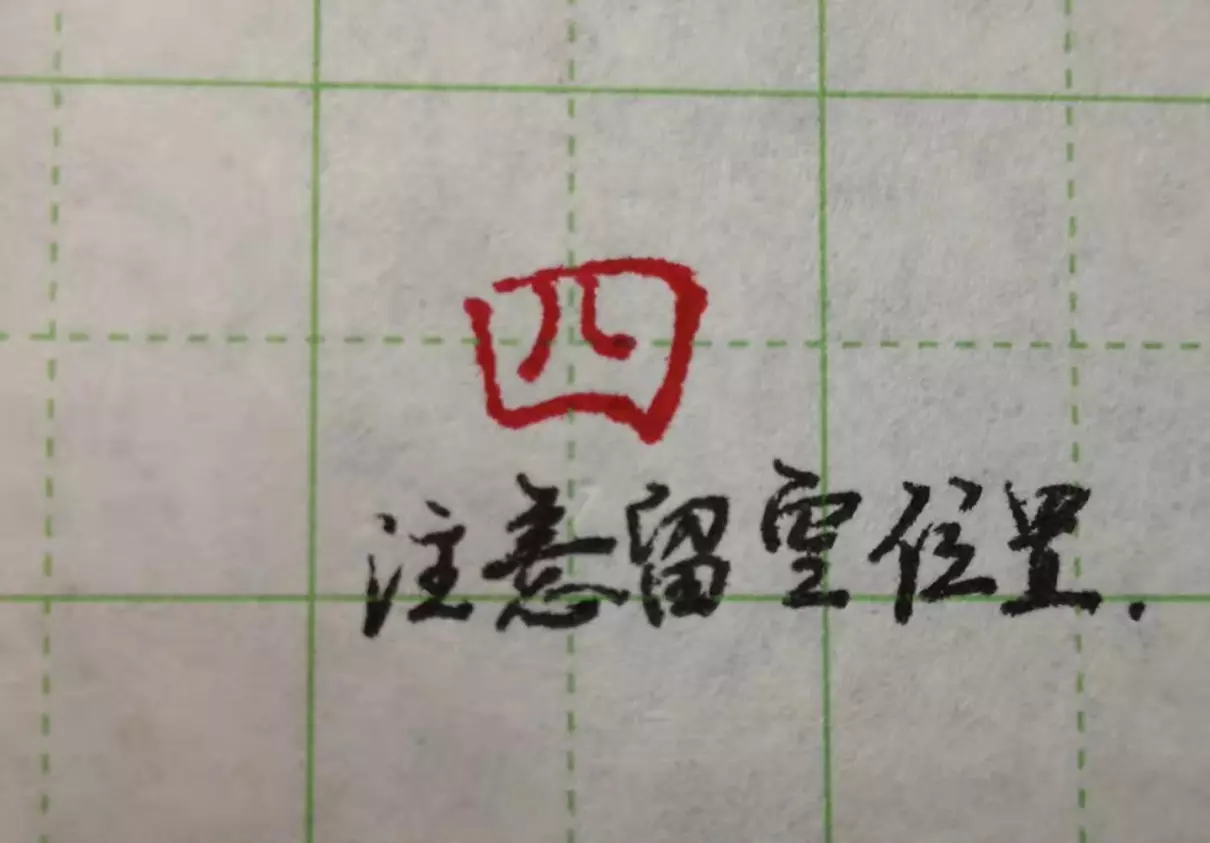 四字,以扁宽为主,书写要注意里面笔画长短不一,留意留空位置。