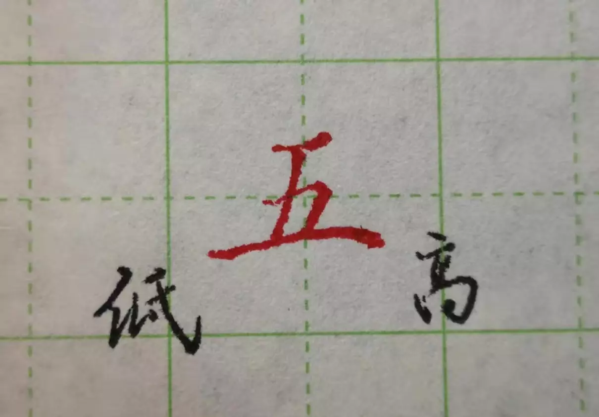 五字,三横等距且平行,中间的斜竖的斜度大概在115度到120度中间,末横左低右高。