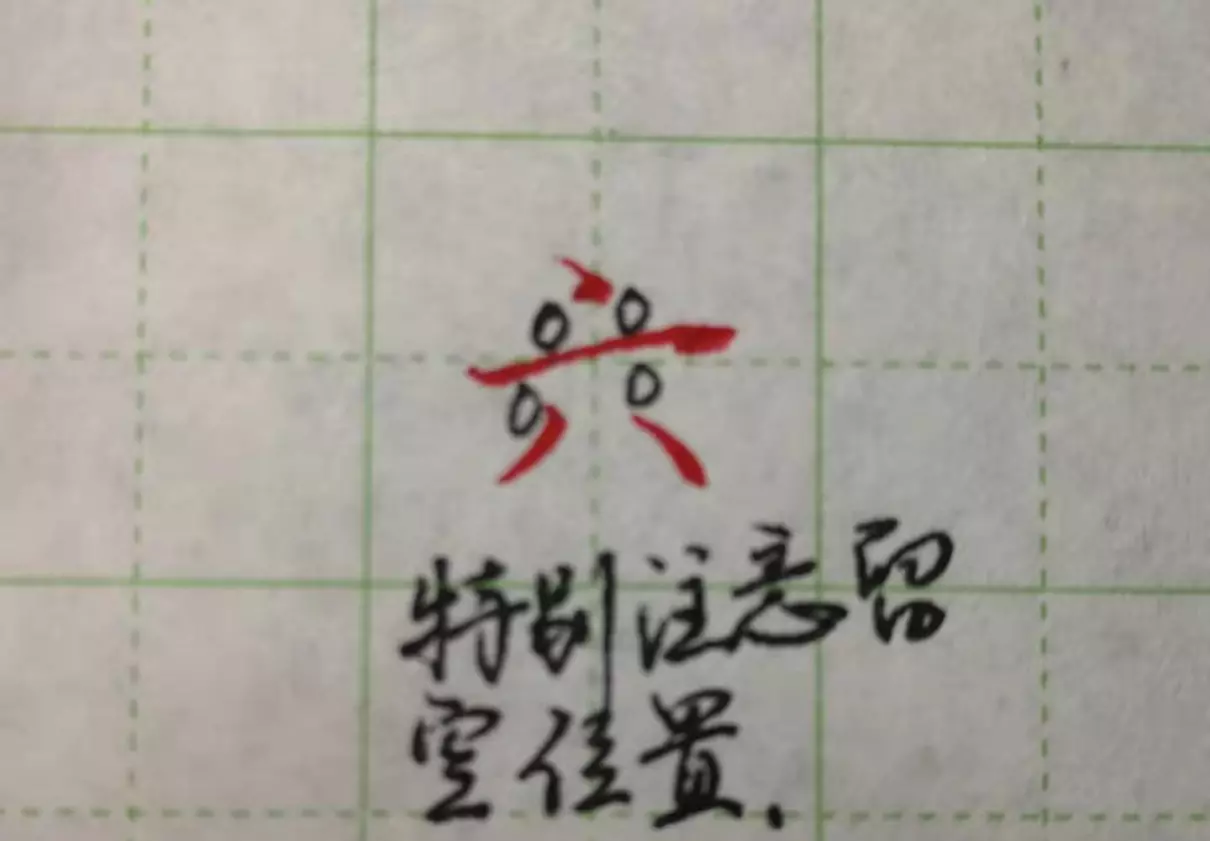 六字,首点居中,注意点、横画、下两点的留空位置,末笔两点左高右低。