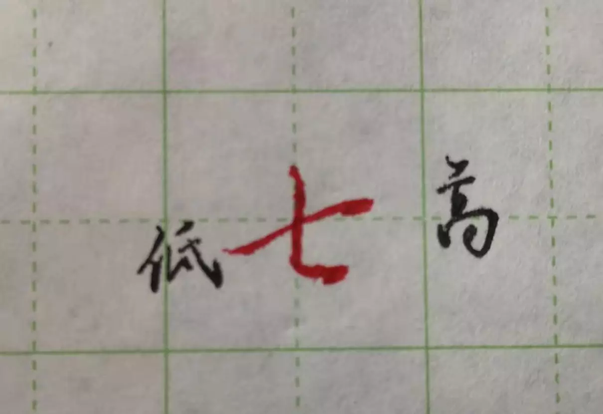 七字,这个字有点特殊,长横要比其他带长横的字的扛肩要大,找到这个特点,七字就容易写好了,中间的竖弯钩在长横的中间位置。