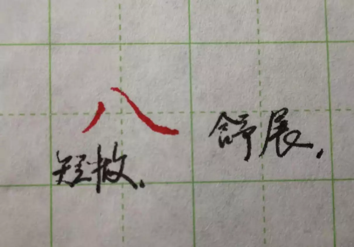 八字,整个短撇跟斜捺的起笔位置在一条线上,撇和捺不在是撇低捺高了,而是在同一水平位置上。