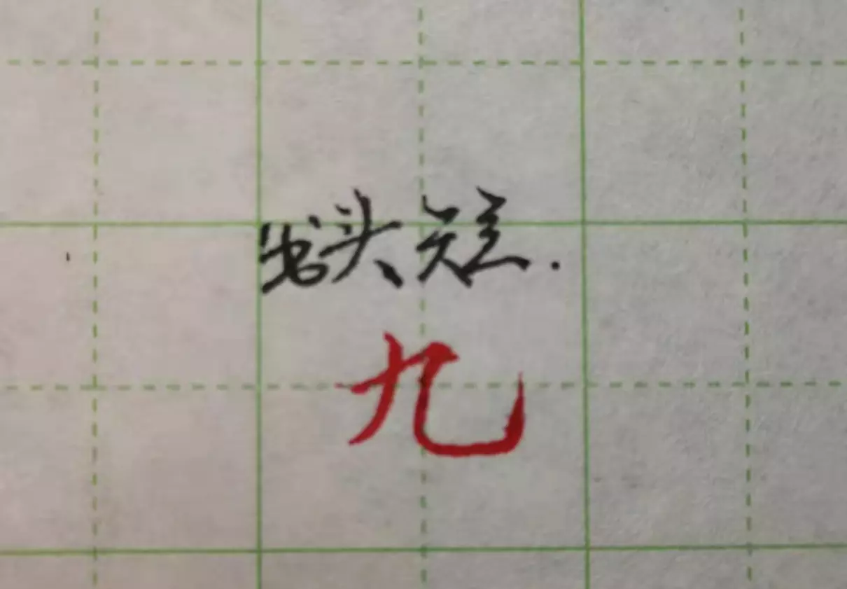 九字,短撇出头要短点,差不多一个点的位置,横折弯钩下部的转折处要圆润,垂直向上出钩。