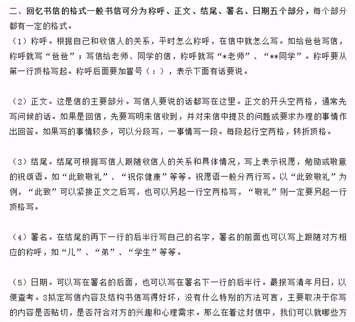 书信格式:开头顶格写称呼(平时怎么称呼,开头就可以怎么写,但是可以加上亲爱的,敬爱的,表示亲切和爱戴),称呼后点冒号。然后,写上问候语。正文,另起一行空两格,正文主要写写信的目的,是有什么事情要求助,还是单纯写自己的情感,都是可以的。总之要把写信的来意,说清楚,事情稍多的,可以分段叙述。结尾,写此致敬礼。此致可以紧跟正文,也可以另起一行,但是敬礼一定要另起一行顶格写。最后落款写名字和日期。