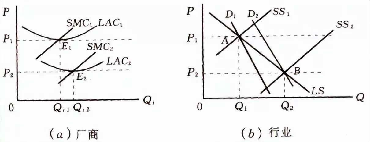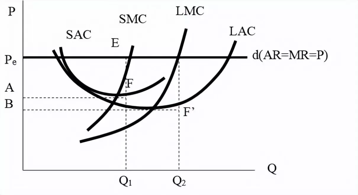 (4)厂商对最优规模的选择(短期在Q1点生产,长期在Q2点生产)