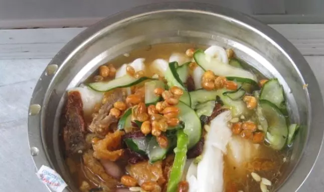 宾阳酸粉 400 克,自制脆皮、黄瓜各 50 克,炸花生 25 克,牛肉巴 10 克。