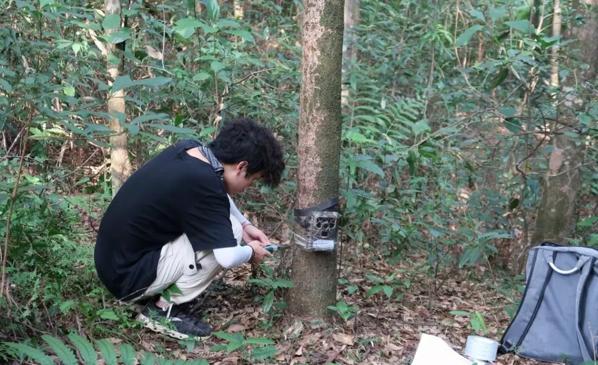 调查人员在东湖公园布设红外相机。