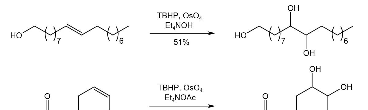 在碱性条件下,四氧化锇催化剂和过氧叔丁醇联合使用可以将烯烃氧化成为双羟基化合物,常用的碱为Et4NOH。该方法可以避免使用化学计量的四氧化锇,从而大大降低了反应成本和毒害性。当底物中含有对碱敏感的官能团时,可以使用Et4NOAc替代Et4NOH进行反应。