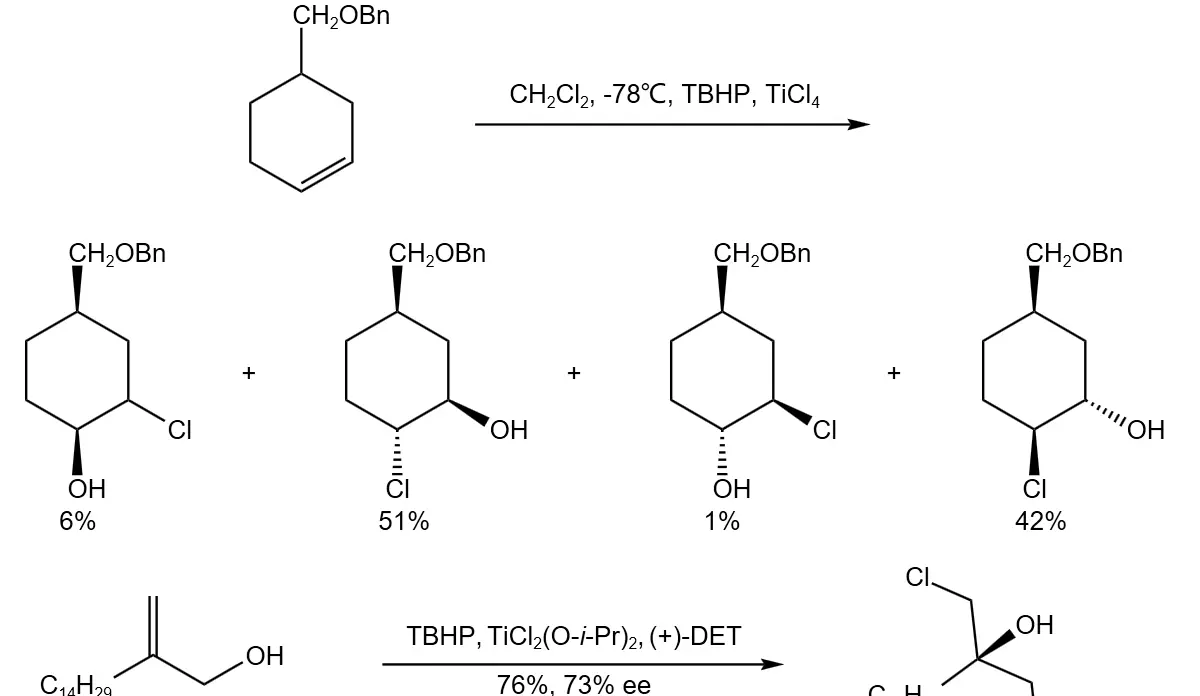 在过氧叔丁醇和四氯化钛的共同作用下,非官能化的烯烃可发生羟基化反应,在底物分子中同时引入氯原子和羟基,当烯丙醇作为反应物时,使用TiCl22 代替TiCl4,并向反应中加入手性配体如-酒石酸二乙酯,可使该反应实现不对称催化。