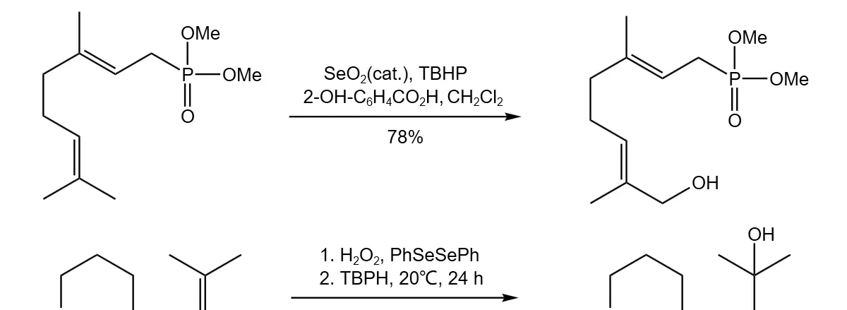 使用催化量的SeO2和化学计量的过氧叔丁醇可以将烯丙位的氢原子氧化成羟基,其后处理较使用化学计量的SeO2方便。对于某些结构的烯烃,在反应中加入羧酸有助于提高氧化的收率,当使用苯基二硒醚与过氧叔丁醇共同氧化烯丙位氢时,可以得到重排的烯丙醇产物。