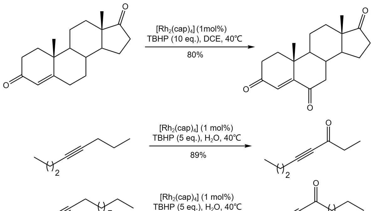 在金属催化剂Rh2(cap)4的催化下,过氧叔丁醇可氧化烯烃和炔烃邻位的氢原子,以较好的收率得到相应的酮,值得注意的是:如果炔烃的两个邻位都含有氢原子,在该条件下得到的是单氧化产物。当炔烃两端分别连有不同取代基时,总是取代较多的一端被氧化。