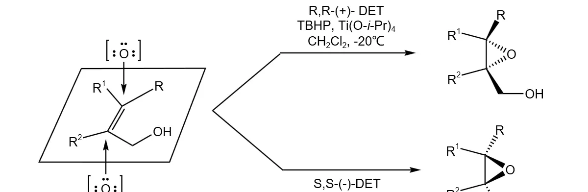 在手性配体的存在下,利用金属催化剂和过氧叔丁醇可实现烯丙醇的不对称环氧化,其中较为成功的是以手性酒石酸酯和钛酸酯组成的催化体系。该体系最早由Sharpless报道,因此这一催化体系又被称为Sharpless环氧化反应,在多数情况下,该反应都能给出90%ee以上的环氧丙醇。该反应对底物中的许多官能团兼容性较好,具有广泛的应用范围。在一定构型的手性酒石酸存在下,根据所使用底物烯丙醇的Z-或E-构型,可以准确地预测产物中新形成的手性中心的构型。