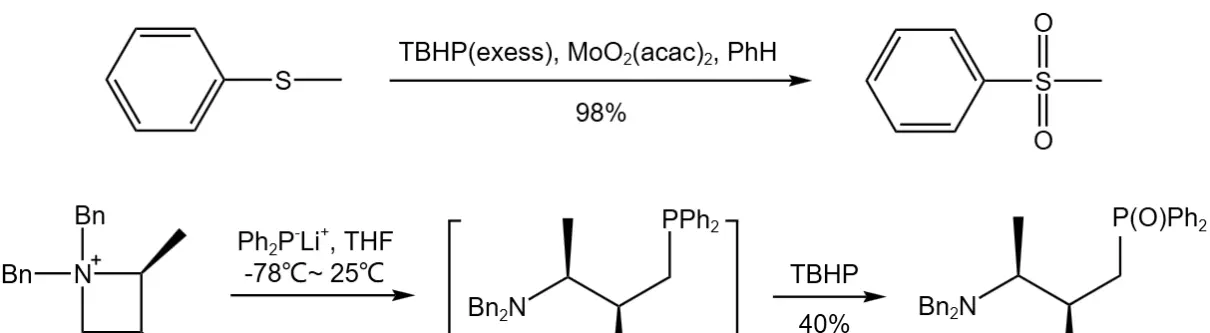 在催化剂作用下,过氧叔丁醇可以氧化含硫化合物生成亚砜。如果使用手性配体,则可以得到手性亚砜化合物。当过氧叔丁醇过量时,反应可继续将生成的亚砜氧化成砜。此外,过氧叔丁醇还可以氧化磷化合物,得到相应的五价磷化合物。