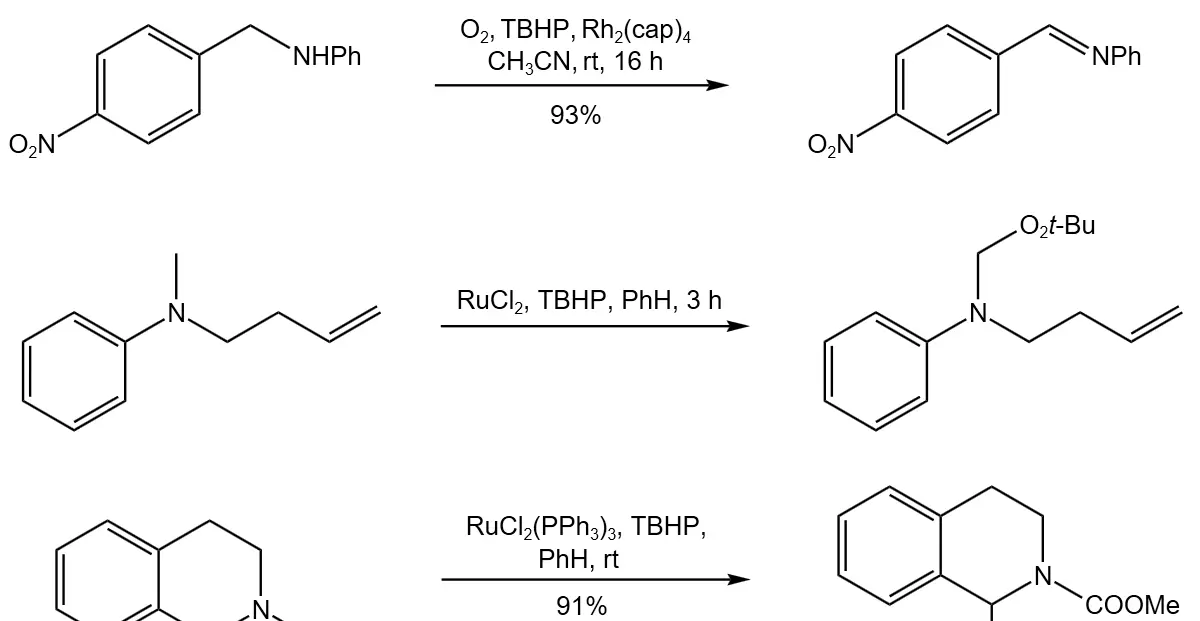 在金属催化剂作用下,含氮化合物可以发生氮原子或碳原子的氧化。其中,仲胺可被氧化成相应的亚胺化合物。在钌盐的催化下,叔胺化合物和仲胺形成的酰胺均可以发生邻位的氧化反应,得到过氧叔丁基取代的产物。