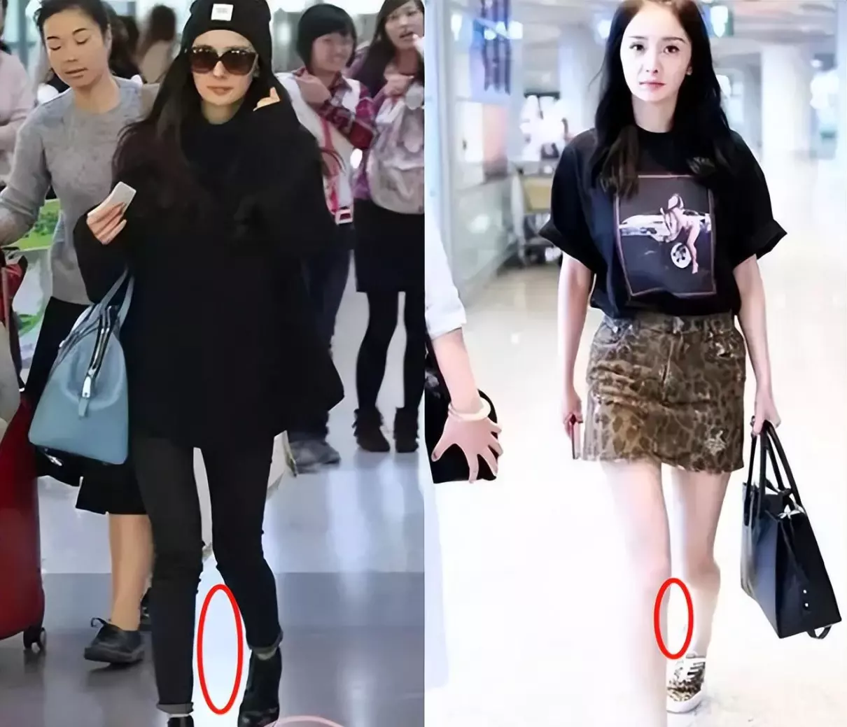 杨颖的好姐妹大幂幂跟她的情况也差不多,杨幂的腿细长,但是并不直,尤其是小腿部分弯折很明显,是个O型腿,走起路来有点内八。