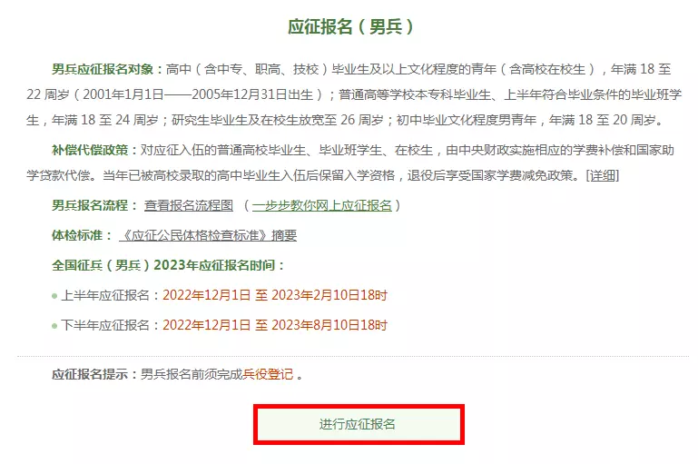 男青年高中(含中专、职高、技校)毕业生及以上文化程度的青年(含高校在校生),年满18至22周岁(2001年1月1日——2005年12月31日出生);普通高等学校本专科毕业生、上半年符合毕业条件的毕业班学生,年满18至24周岁;研究生毕业生及在校生放宽至26周岁。