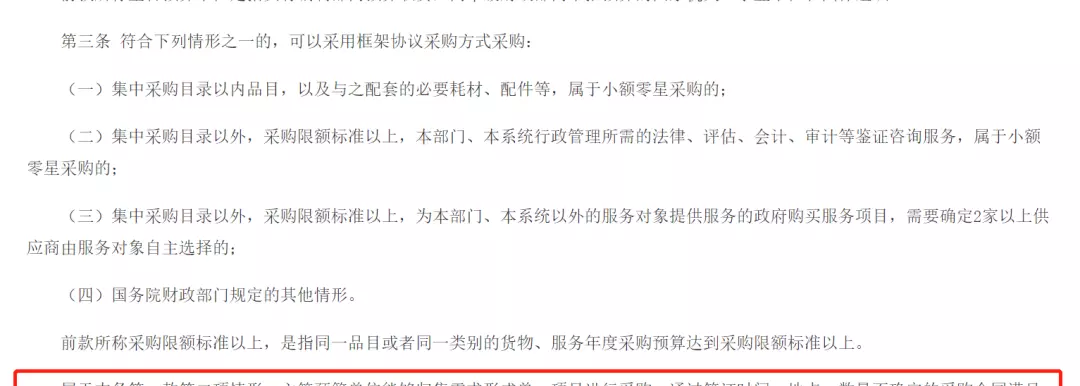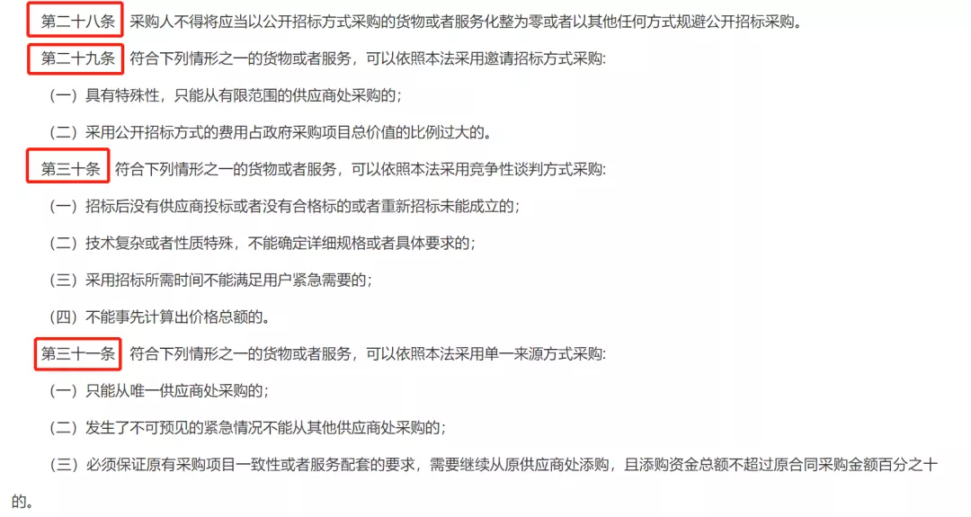 需要注意的是,《政府采购法实施条例》第二十三条规定,采购人采购公开招标数额标准以上的货物或者服务,符合政府采购法第二十九条、第三十条、第三十一条、第三十二条规定情形或者有需要执行政府采购政策等特殊情况的,经设区的市级以上人民政府财政部门批准,可以依法采用公开招标以外的采购方式。