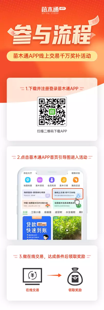 活动期间,前1500名完成10000元线上交易额的苗木通商家,可领取500元“体验奖”奖金。累积线上交易额达30000元,可申请最高14000元“累积奖”奖励。
