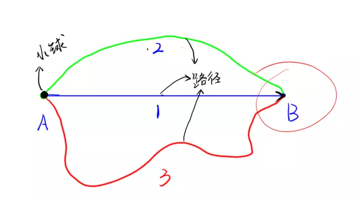 比如上图图,黑色的小球要从A到B,它有三条路可以走。可以选择蓝色路径1,这时最短的一条路径,当然也可以走绿色路径2或红色路径3,它们于蓝色路径1比较,就是要走一些路。这些绿色路径或红色路径的总长度,明显要大于蓝色路径。但他们的位置变化却是相同的,可见物体运动的路径与其位置变化并不是一回事。