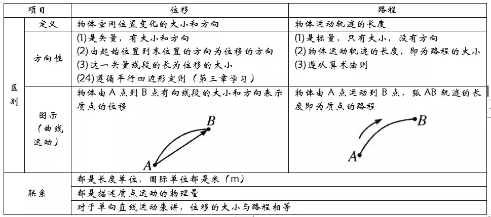 ③它们之间只能比较大小,不能划等号。由于位移是矢量,而路程是标量,所以位移不可能和路程相等;但位移的大小有可能和路程相等,只有质点做单向直线运动时,位移的大小才等于路程;否则,路程总是大于位移的大小.在任何情况下,路程都不可能小于位移的大小。