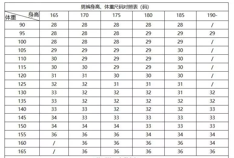 生活中常见服装有两种型号标法:一是S(小)、M(中)、L(大)、XL(加大);二是身高加胸围的形式,比如160/80A、165/85A、170/85A等。第一种标注不规范。不管是国产服装还是进口服装,必须按中国的服装型号标准GB/T1335标注型号,英文字母只能作为辅助代码标注。 男装裤子尺码对照表及换算 29码=2.2尺腰=73.5cm/30码=2.3尺腰=77cm/31码=2.4尺腰=80cm 32码=2.5尺腰=83.5cm/33码=2.6尺腰=87cm/34码=2.7尺腰=90cm 36码=2.8尺腰=94cm/38码=2.9尺腰=96cm/40码=3.0尺腰=100cm 男裤身高、体重对照表 具体尺寸测量方法