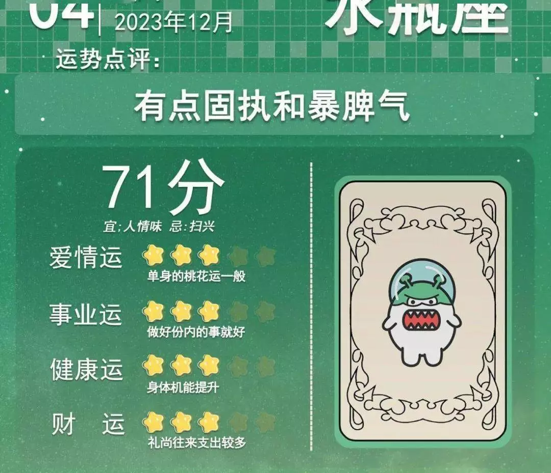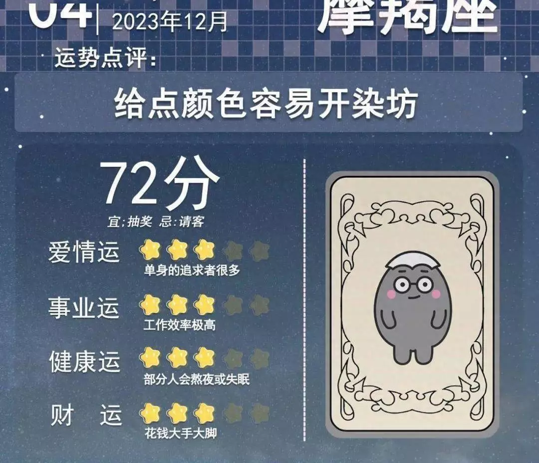 在2023年12月04日这一天,星座们将会迎来怎样的运势呢?下面将从爱情运势、事业运势、财运展望、健康指南以及幸运颜色几个方面为大家介绍,让我们一起来看看吧!