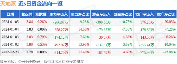 1月5日的资金流向数据方面,主力资金净流出266.87万元,占总成交额9.28%,游资资金净流出309.36万元,占总成交额10.75%,散户资金净流入576.23万元,占总成交额20.03%。
