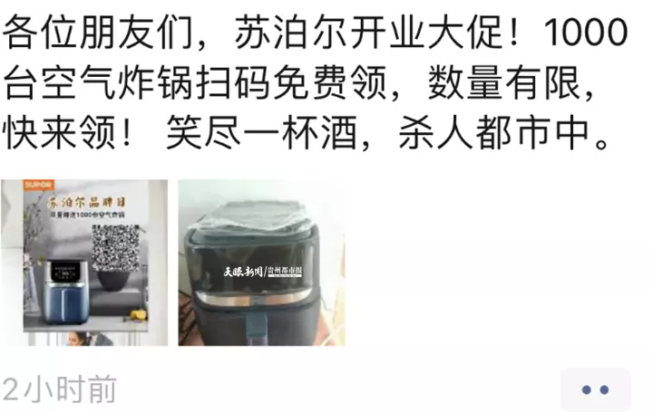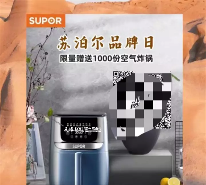 “1000台空气炸锅扫码免费领,数量有限,快来领!……”连日来,多名安顺市民在自己的微信朋友圈中转发着这一条消息。同时,消息中还配上了两张图片。其中一张图片上文字为“苏泊尔品牌日,限量赠送1000份空气炸锅”,同时,还附上了一张二维码,另一张图片则是一个空气炸锅。