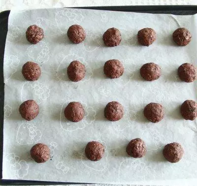 8、预热烤箱,上下180度。带上PVC手套,分成15克一个,搓成球,排入垫了油纸的烤盘上。
