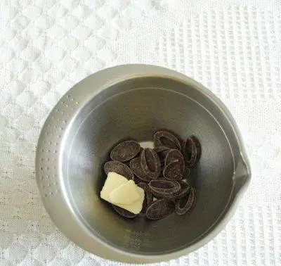 2、巧克力币和黄油放入干净盆中。这次选的是66%纯可可脂的巧克力,口感刚好,微甜不腻。