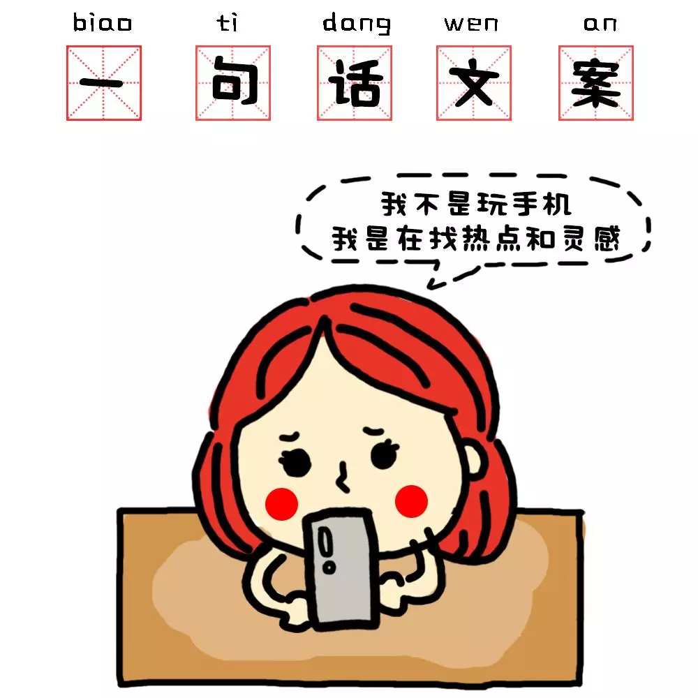 关于一句话文案,我平时会把一个主题拆成多个角度来看和思考。然后去全网搜相关的流行词,一通记下来,最后排列组合。同时也建立了热门词汇的清单,如果这次用不着,留着下次可以用。