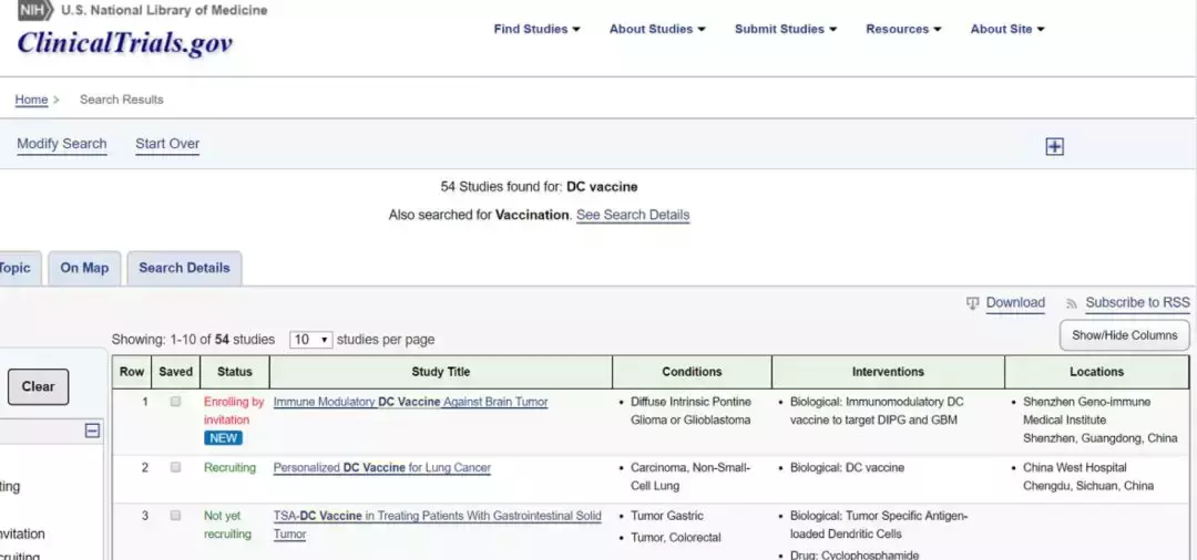 临床中正在开展许多针对癌症的治疗性疫苗接种途径。在国际临床试验官网clinicaltrials.gov中搜索术语树突细胞疫苗,有54个临床研究。这些研究中的一个共同特征是疫苗接种的关键步骤是将癌抗原有效呈递给T细胞。因为DC是最有效的抗原呈递细胞,因此,利用它们的多样性可能产生改进的治疗性疫苗。树突细胞疫苗在各个癌症中取得了令人振奋的研究数据,想了解临床试验详细招募信息的患者可致电全球肿瘤医生网医学部进行初步评估