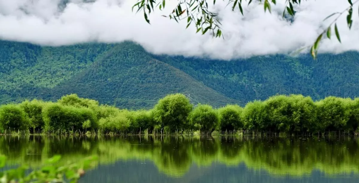 翠绿的树林围绕着村落,一脉青山在城郭外隐隐横斜。