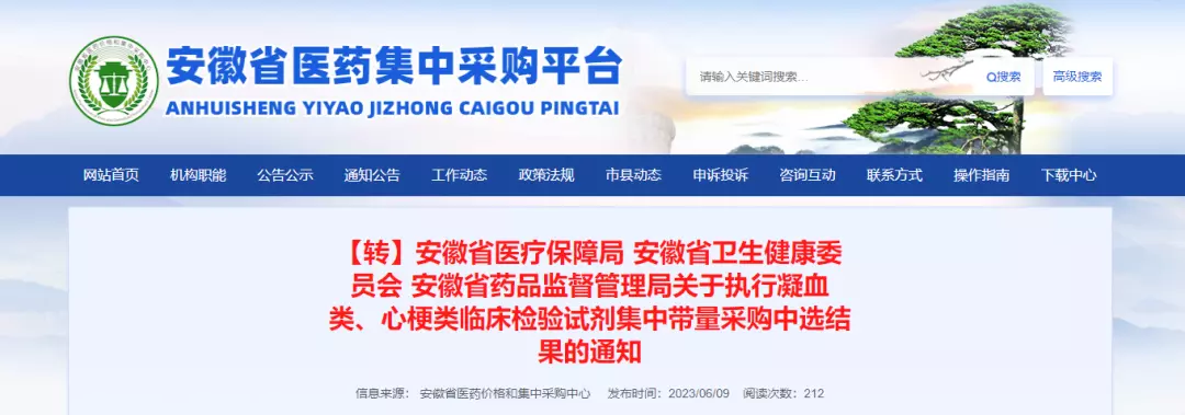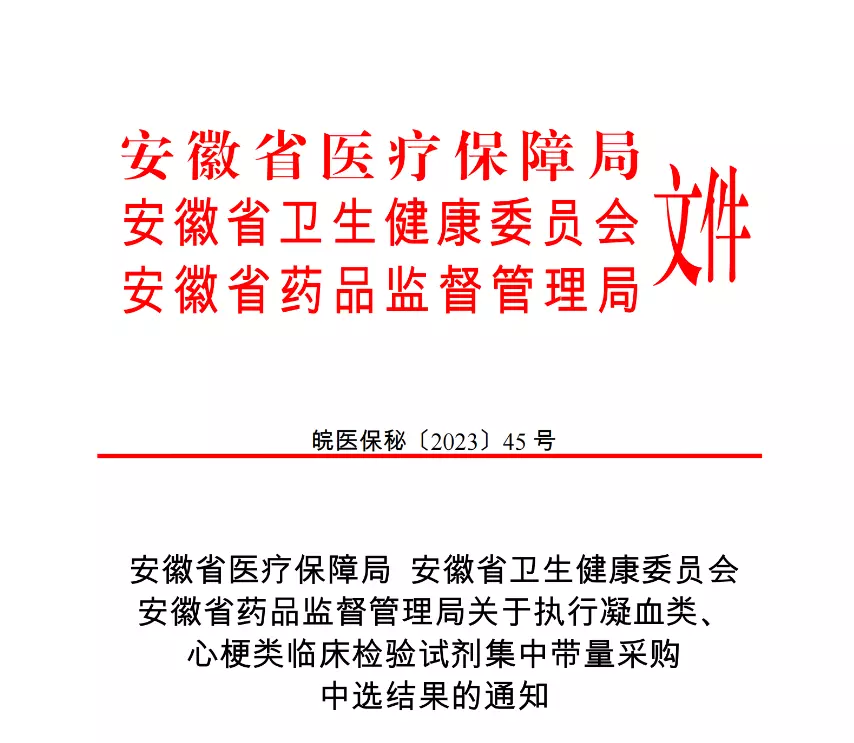 2023年6月9日,安徽省医疗保障局、安徽省卫生健康委员会、安徽省药品监督管理局三部门联合发文,发布了《安徽省医疗保障局安徽省卫生健康委员会安徽省药品监督管理局关于执行凝血类、心梗类临床检验试剂集中带量采购中选结果的通知》。