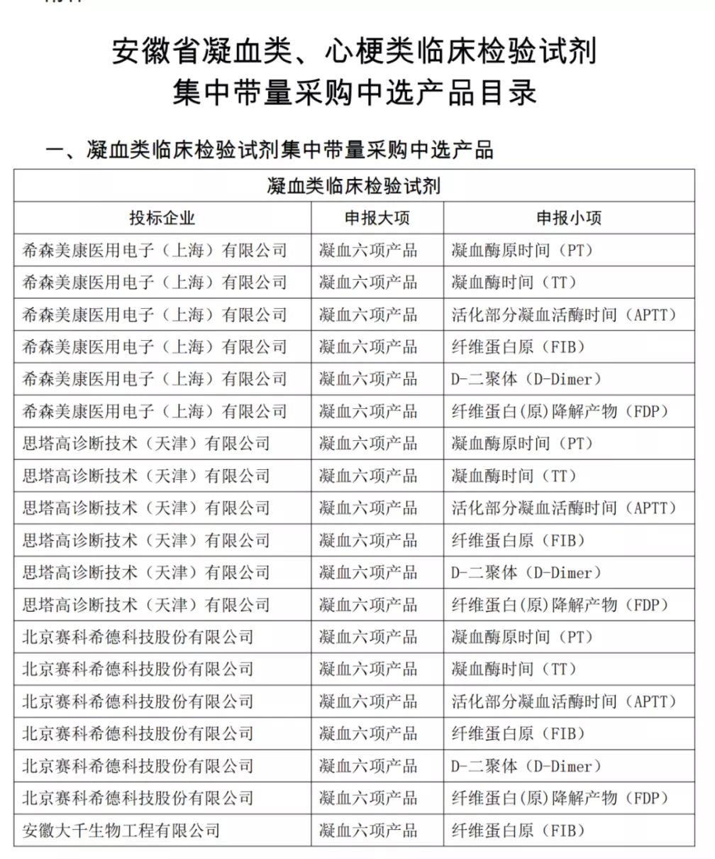 附件:安徽省凝血类、心梗类临床检验试剂集中带量采购中选产品目录
