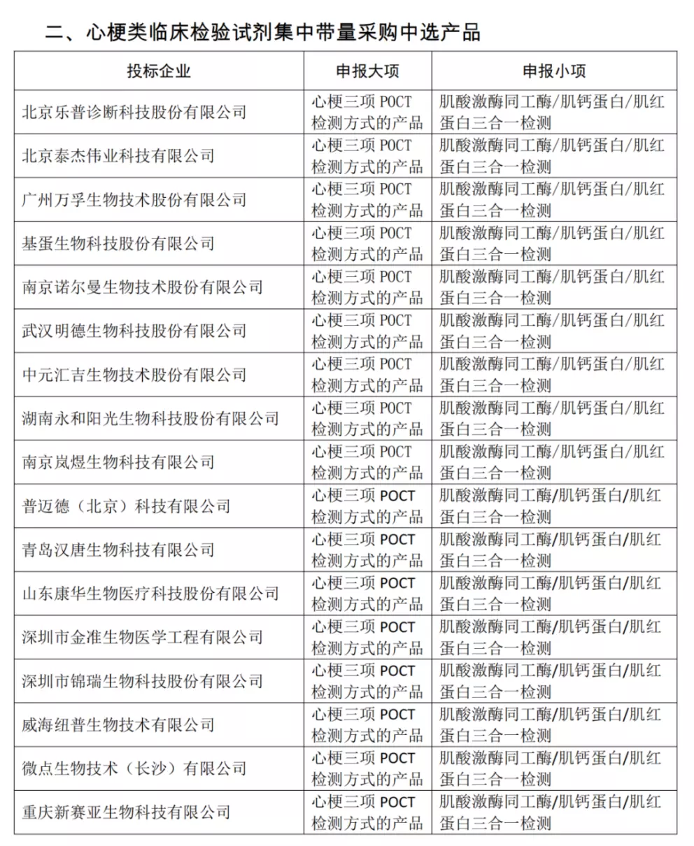 心梗类产品共有18家企业入围,均为肌酸激酶同工酶/肌钙蛋白/肌红蛋白三合一检测。