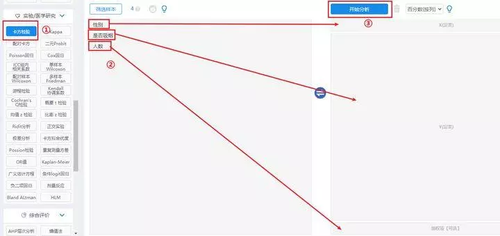 点击实验/医学研究面板中的【卡方检验】-拖拽三个【分析变量】分别到对应分析框-【开始分析】即可。