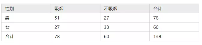 想研究性别和是否抽烟之间有没有关系,男性抽烟的比例有没有更高等,通过抽样调查得到如下数据: