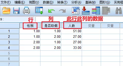 第三列存入每一种情况所对应的数据(人数),如:是男性且吸烟的人数有51人。