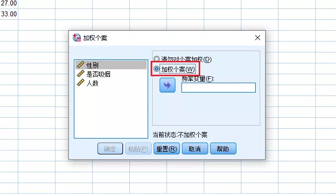 弹出加权个案操作的对话框,选中【加权个案】