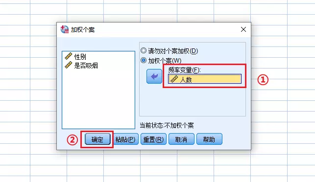 因为输入的数据是汇总格式,所以在进行卡方检验之前,我们需要先对数据加权处理,加权处理后,系统会将“人数”这一列的变量识别为频数,而不是一个数值。