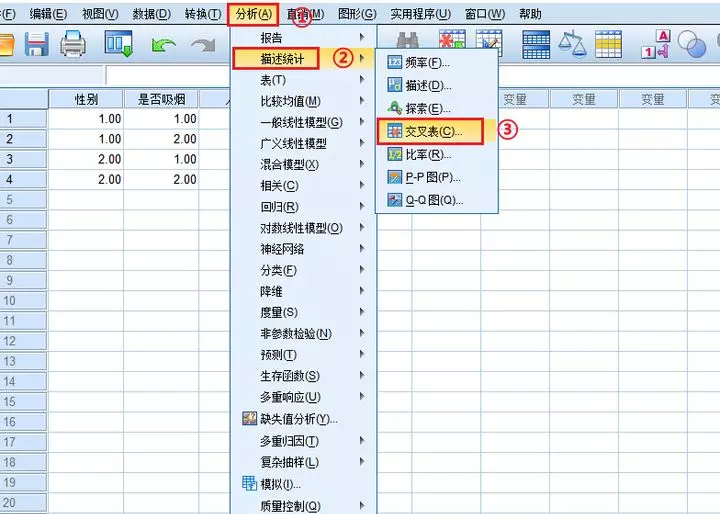点击【分析】-【描述统计】-【交叉表】